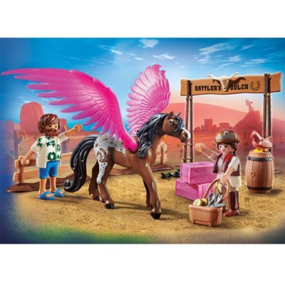 Los hermanos Marla y Charlie se adentran repentinamente en el mágico y colorido universo PLAYMOBIL y se separan. Para encontrar a Charlie de nuevo, Marla se embarca en la aventura de su vida. Por suerte, conoce a Del, un entrañable y divertido cocinero de food truck, que la ayuda en su travesía por este fantástico mundo de alocadas reglas. Su búsqueda los lleva también al Oeste, donde encuentran un caballo con alas. Y este no será el único encuentro extraño en su viaje. PLAYMOBIL: The Movie es la primera película de animación inspirada en el mágico mundo de PLAYMOBIL y transporta al público a una aventura épica, divertida e inolvidable. Conoce a Marla, Charlie, Del, Rex y muchos otros amigos y crea tu propia historia. El juego contiene personajes de la película, como Marla con traje de vaquera, el caballo con alas rosas, un pollo, heno mágico, una valla y muchos accesorios más.