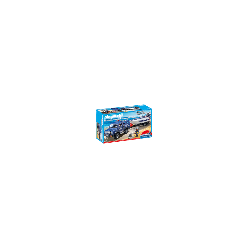 Coche de policía con remolque para transportar la lancha. El techo del coche se puede quitar y la lancha flota. A la lancha también se le puede incorporar el motor submarino. Incluye dos figuras policía equipadas con cascos, micrófonos, linterna, cámara, prismáticos, pistolas y escopetas.