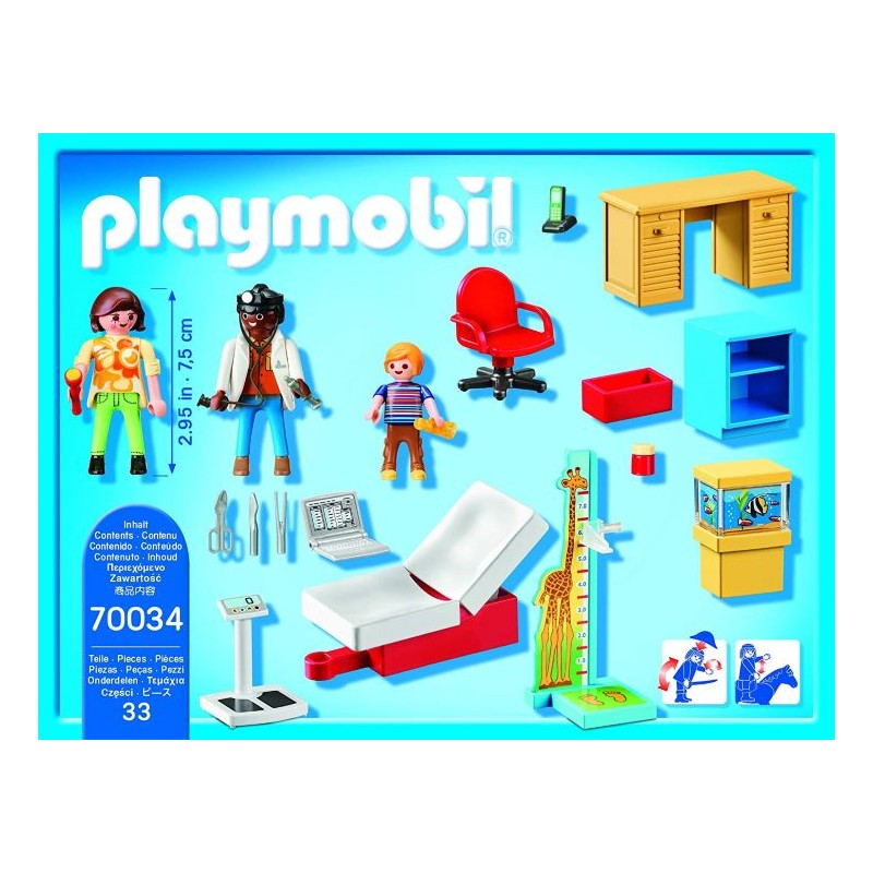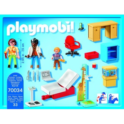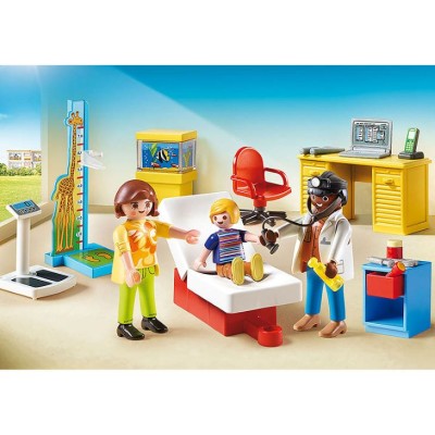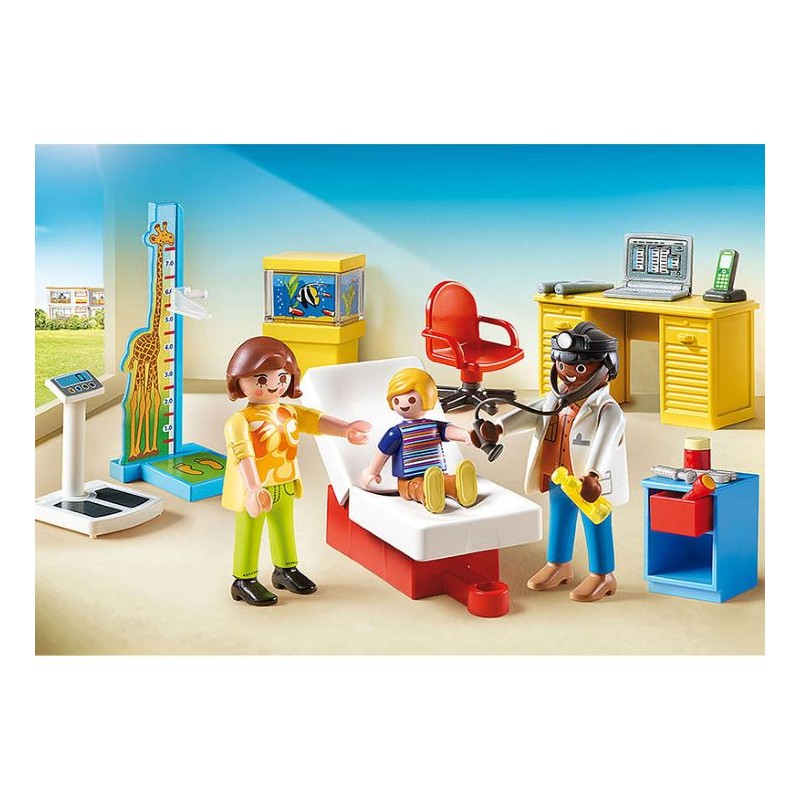 La consulta del médico está equipada con una camilla para el paciente plegable y ajustable. Playmobil starterpack consulta de pediatría, playset de 33 piezas que contiene 3 figuras playmobil ( dos adultos y un niño), una madre y su hijo que acuden a la consulta de pediatría equipada con camilla adaptable, medidor de altura regulable, mobiliario de oficina y utensilios de doctor las figuras playmobil tienen miembros articulados, manos para agarrar los accesorios a juego, cabeza giratoria, etc fomenta el juego simbólico y ayuda al desarrollo de la imaginación y creatividad recomendado a partir de 4 años.