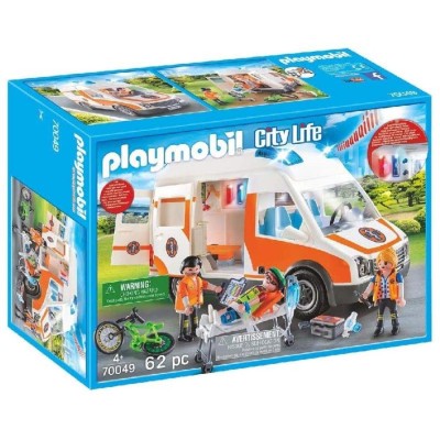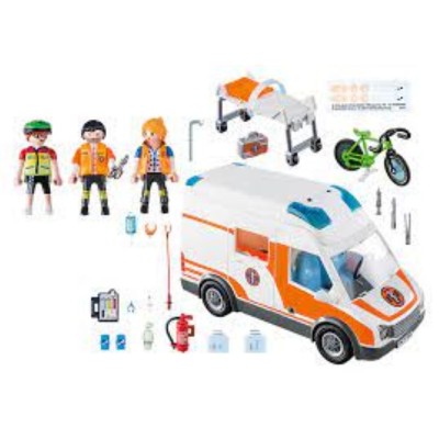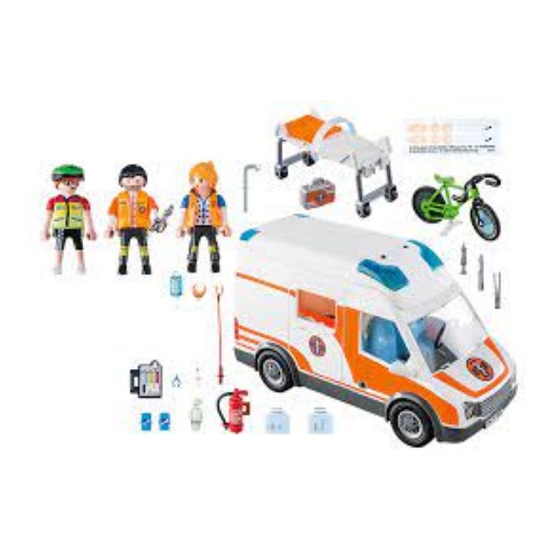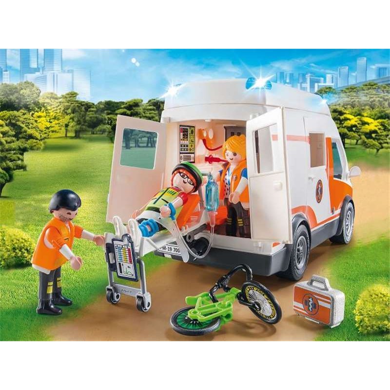 ¡Dios mío, un accidente en la carretera principal! Un chico se cayó con su bicicleta. Afortunadamente, la ambulancia estaba en cerca y llegó inmediatamente. La rodilla está lesionada y el niño no puede caminar, pero está despierto y puede hablar. Los paramédicos despliegan la camilla, ponen al niño en ella, luego lo suben a la ambulancia y con la luz azul y la sirena van al hospital. El techo de la ambulancia está equipado con luces multi-sonido e intermitentes y es desmontable. La camilla de la ambulancia es plegable. Dentro de la ambulancia hay un monitor iluminado. Nota: No se incluyen las baterias en el juego.