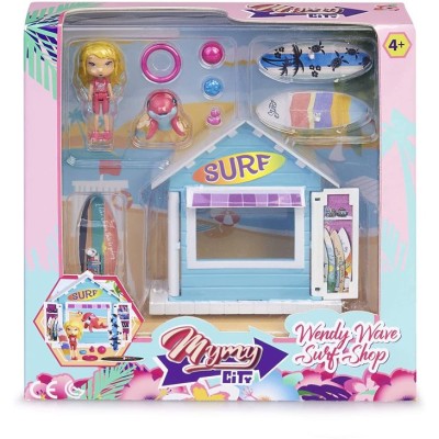 El set incluye el personaje de wendy wave, una niña vestida con estilo surfero, tres tablas de surf, un módulo reversible que simula una tienda de surf y diferentes accesorios; incluye a wanda, su mascota delfín