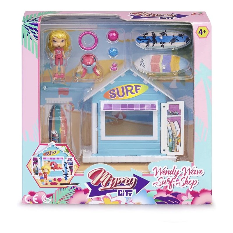Le encanta el mar y surfear las olas; tiene su propia tienda de surf con tres tablas diferentes y la acompaña wanda el delfín; mymy city wendy wave es el set de muebles con personaje y mascota para seguir decorando y aumentando la ciudad
