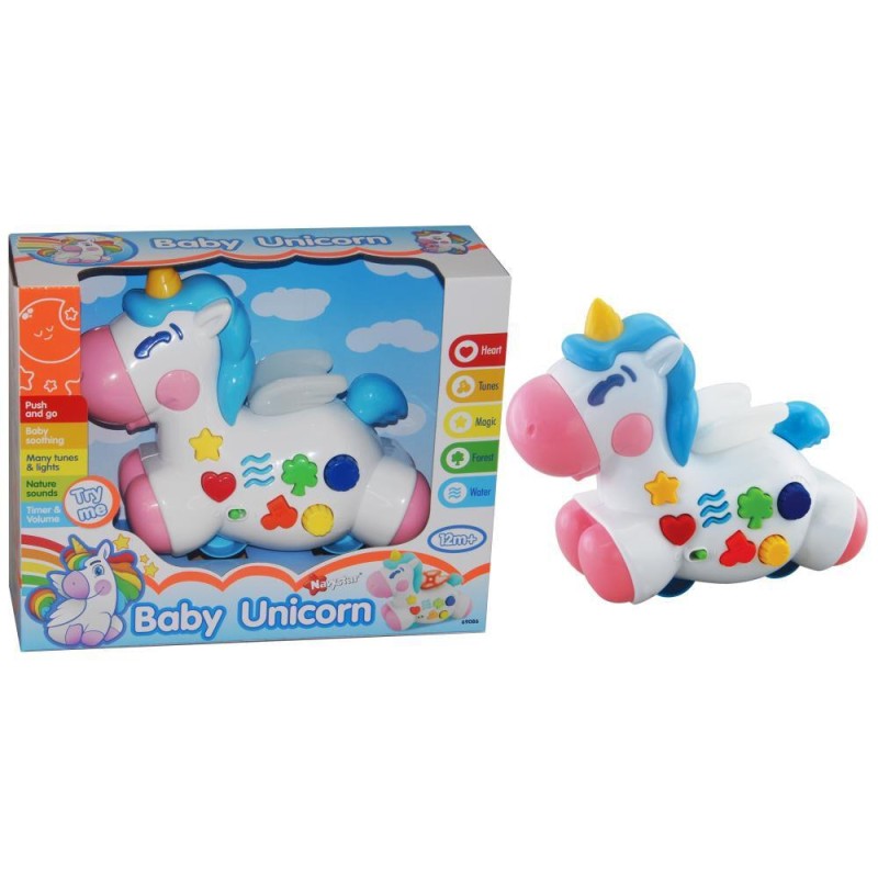 Este Bebé Unicornio le encantará a los pequeños, ¡es un bebé con otro bebé!. Cuenta con una gran cantidad de actividades que los dejarán hipnotizados ya que si tocan los diferentes botones podrán ver las distintas modalidades de juego que cada una de ellos conlleva con sus diferentes sonidos y luces que captarán toda su atención ¡Hasta sus alas se iluminan!. Este bebé unicornio Interactivo también le enseñará las distintas formas como corazones, estrellas… también podrás elegir el volumen que quieres que tenga. Lleva pilas incluidas. Edad recomendad +1A. Juguetoon. Ref.:69086