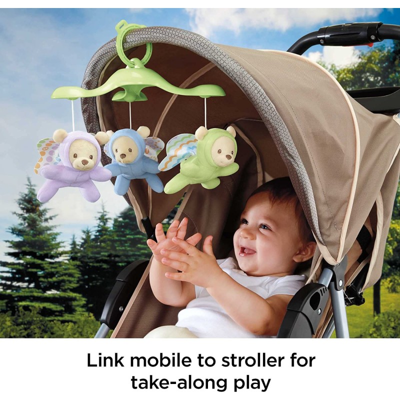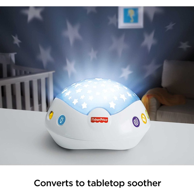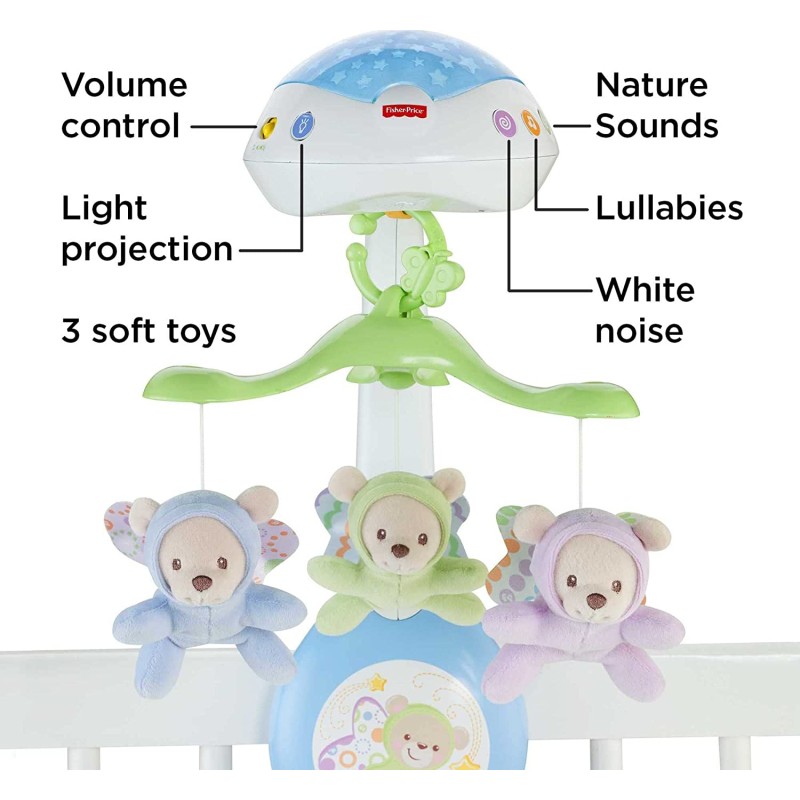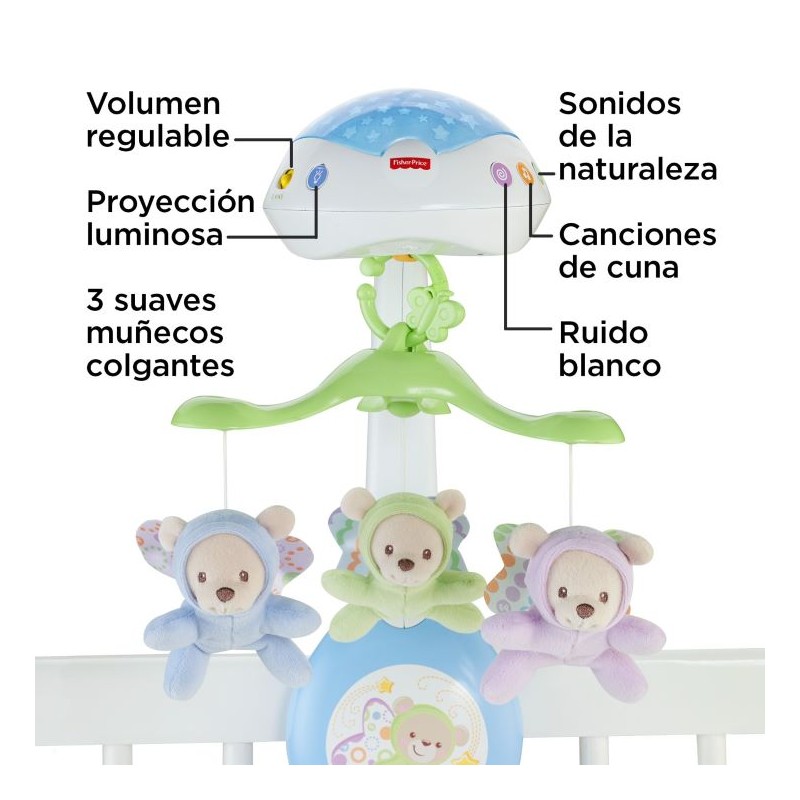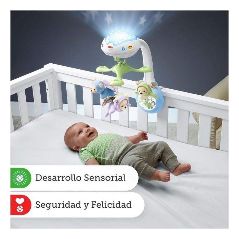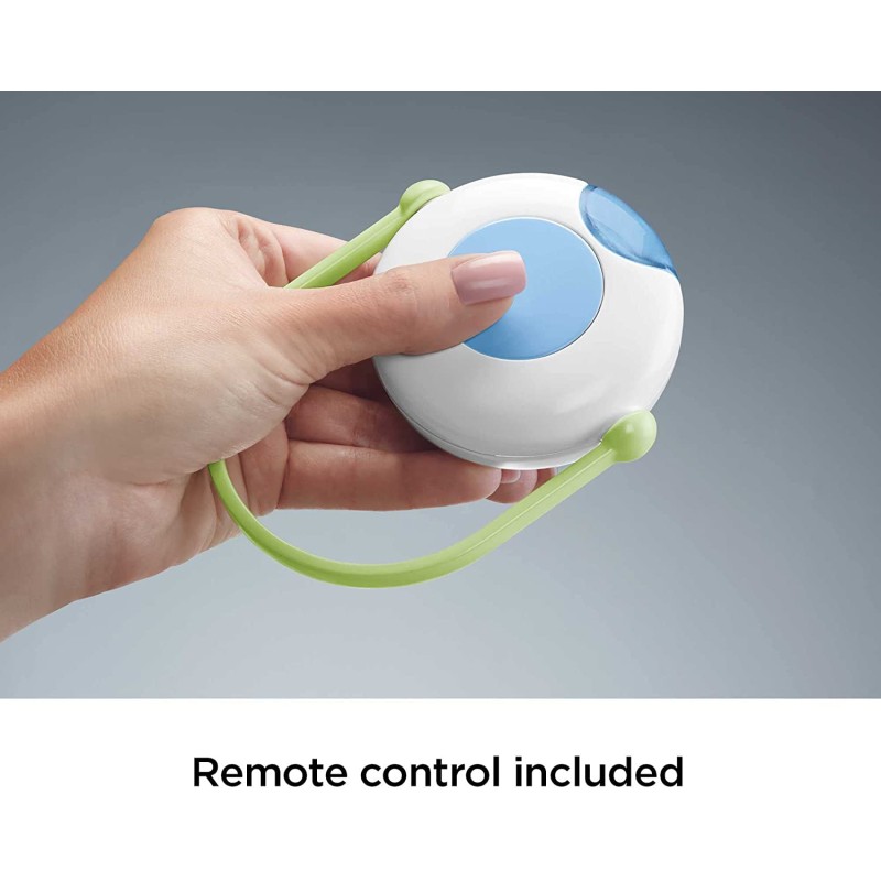 Luces y sonidos relajantes para el sueños de los más pequeños. ¡Con control remoto! A través de imágenes reconfortables, luces de estrellas, susurros, música (hasta 30 minutos de nanas) y sonidos de la naturaleza, podrás crear el clima más relajantes y entretenidos. Puedes usarlo como móvil de cuna y aprovechar sus movimientos motorizados, sus proyecciones luminosas y varias opciones de sonido. O si lo prefieres también se convierte en un proyector musical de mesa, así podrás usarlo fuera de la cuna. - Funciona con 4 pilas AA (No incluidas)