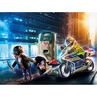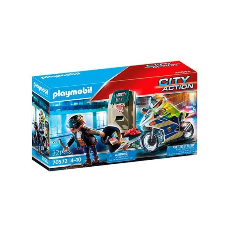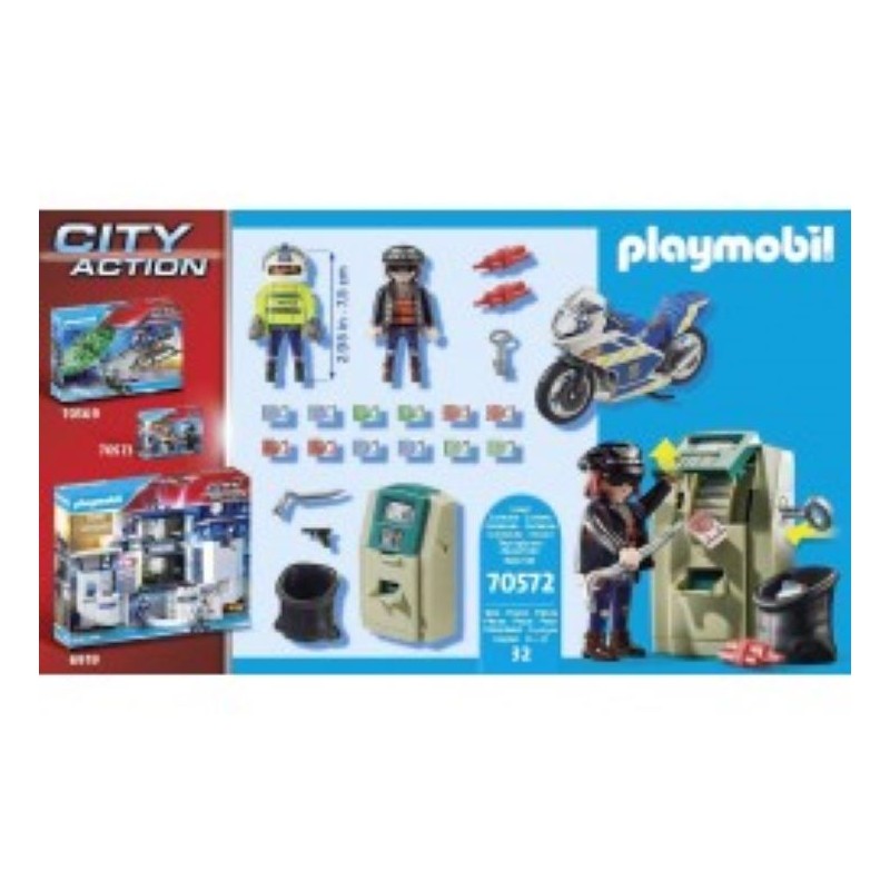 Misión para la moto de policía: PLAYMOBIL Persecución del ladrón de dinero con policía, ladrón y accesorios para una recreación detallada - Cajero automático con llave para abrir y llenar de dinero, palanca para abrir la máquina, motocicleta con soporte plegable y mucho más. - Juego de figuras para niños a partir de 4 años: Ideal para el tamaño de sus manos y bordes redondeados agradables al tacto - Para jugar a diario: Incluye instrucciones para montarlo con ayuda de los padres, Alta calidad y diseño robusto, Limpieza de las piezas (sin pegatinas) con agua corriente y sin químicos - Contenido: 1x PLAYMOBIL City Action Moto de Policía: Persecución del ladrón de dinero, Juego de 32 piezas con instrucciones: 1 moto, 1 máquina expendedora, 2 figuras, 28 accesorios, Material: plástico, Se puede montar individualmente, Peso: 100 g, 70572