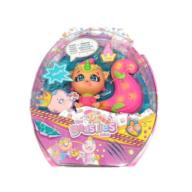 Los Glusty son los Beasties con más imaginación. Son tan fantasiosos que creen que pueden hasta volar. Un día se creen un hada y al siguiente un unicornio así que cuidado con que no se crea que puede volar. Cada Beastie viene con su accesorio, pañal y su Beastiepedia.