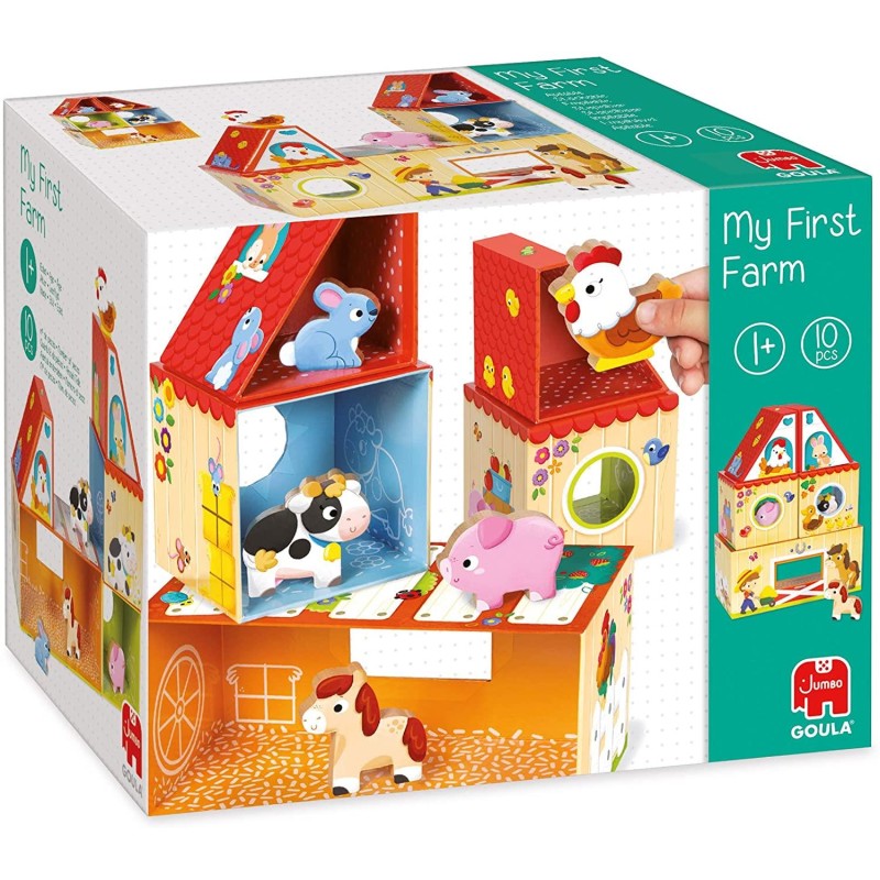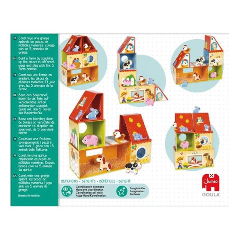 Juego para la primera infancia que consiste en construir una granja apilando las piezas de diferentes maneras. Existen muchas combinaciones posibles para formar diferentes granjas. Hay 5 animales de madera: una gallina, una vaca, un caballo, un cerdito y un conejo para poder jugar y dar trabajar la imaginación una vez la granja esté construida. El juego está ilustrado por dentro y por fuera y todas las piezas se pueden guardar dentro de la pieza más grande.