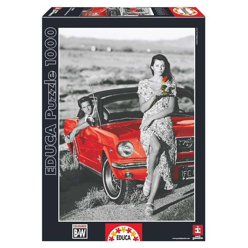 Puzzle de Educa de 1000 piezas Country romance. Con una romántica imagen de una pareja en blanco y negro, contrastando con el coche y la rosa roja. Las piezas son de cartón. Incluye "fix puzzle" para fijar las piezas y posteriormente poder enmarcarlo. Incluye servicio de pieza perdida.