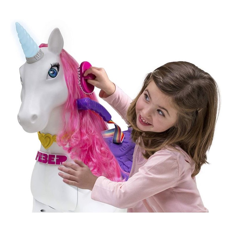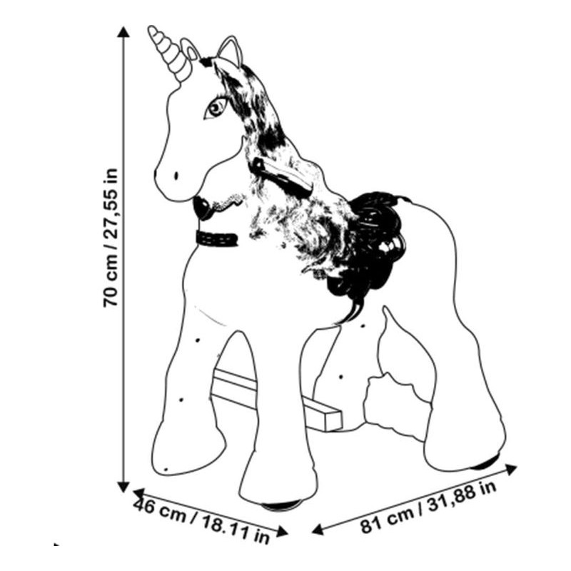 My lovely unicorn de feber es un unicornio con batería de 12 v para niños y niñas entre 3 y 7 años Para jugar con él dentro y fuera de casa: se puede cabalgar en 4 direcciones (adelante, atrás, izquierda y derecha) con una velocidad máxima de 3 km/h Su cuerno mágico emite sonidos y se ilumina cuando lo acaricias; además en el asiento encontrarás un cepillo para peinar su larga melena rosa y su cola Es muy fácil de transportar tirando de las riendas y se puede almacenar fácilmente en cualquier lugar de la casa; medidas aproximadas: 48 cm de ancho x 70 cm de fondo x 83 cm de alto Montaje sencillo en 10 minutos; instrucciones, cargador y batería incluídos