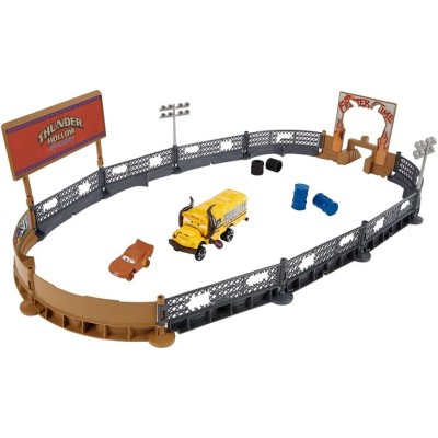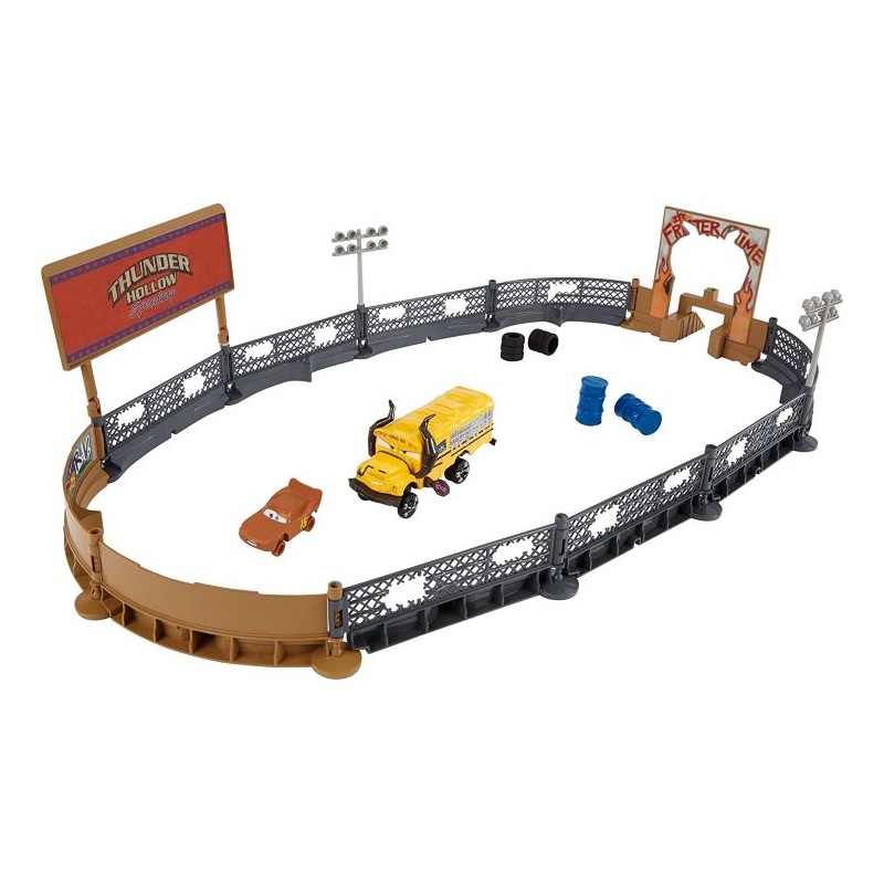 Recrea las emocionantes escenas de carreras de la nueva película Cars 3 de Disney Pixar con esta pista cargada de acción. La increíble y detallada pista está inspirada en la carrera Crazy 8 Derby que desafía al campeón Rayo McQueen con retos nuevos y dinámicos. Acelera tus motores y mira cómo los vehículos corren y chocan durante toda la carrera. La pista incluye barriles, ruedas y otros accesorios temáticos, así como un vehículo de Rayo McQueen cubierto de barro a escala 1:55 para comenzar las carreras nada más abrir la caja. Gana el primer vehículo en derribar el autobús de la Srta. Fritter. Luego, reconfigura la pista y prepárate para otro momento épico. Con tres opciones de configuración de la pista y varios obstáculos y desafíos de velocidad, las carreras de Cars 3 no se acaban nunca. Los vehículos adicionales se venden por separado y están sujetos a disponibilidad. Los colores y decoración del juguete pueden ser distintos de los mostrados.