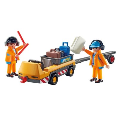 Vehículo transportador de maletas que incluye 3 maletas convencionales y una maleta con ruedas. Dos figuras con señales para indicar cuándo se puede acercar el vehículo al avión y descargar o cargar.