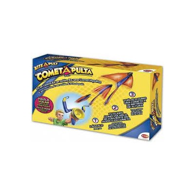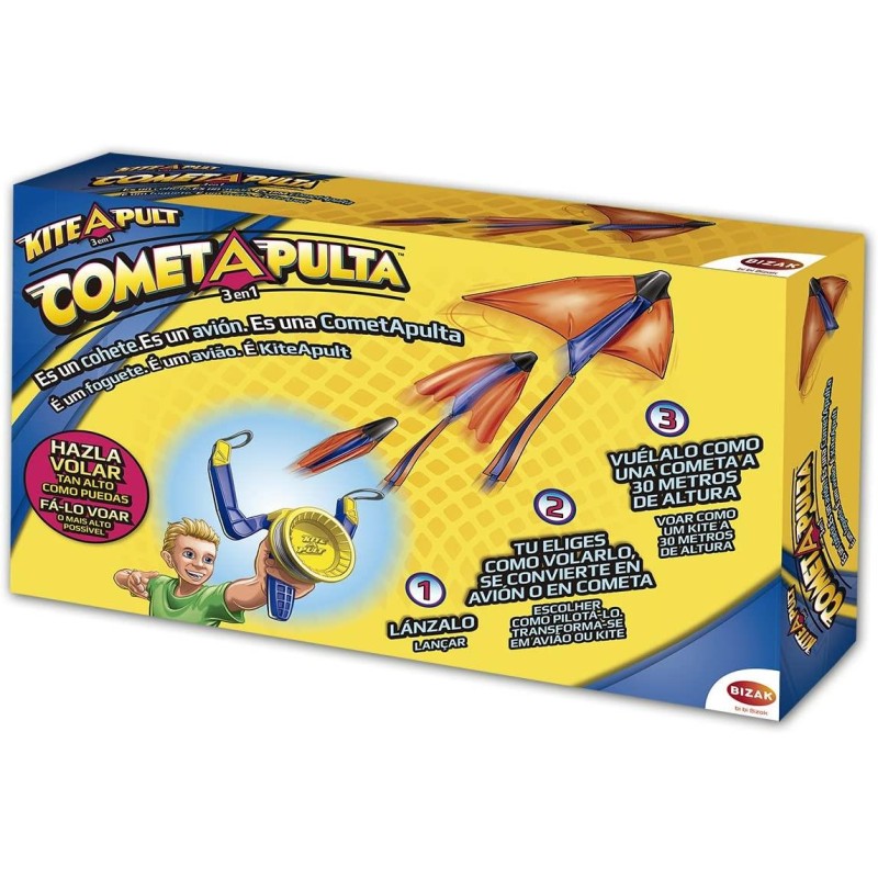 La Comet-A-Pulta es un juguete en 3 en 1 Incluye: una cometa y un lanzador Es necesario un viento constante de al menos 16 km/h para que el juguete pueda volar como una cometa Edad mínima recomendada: 10 años