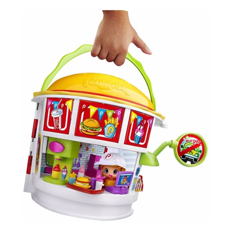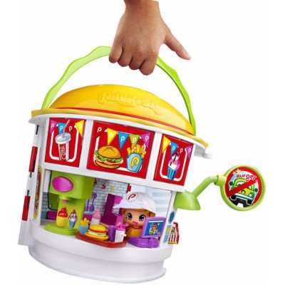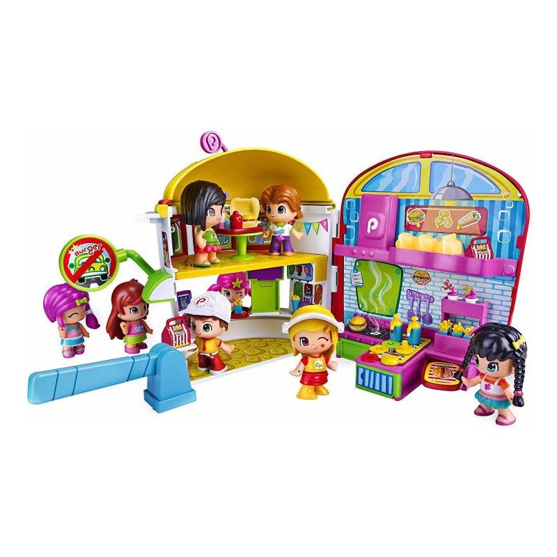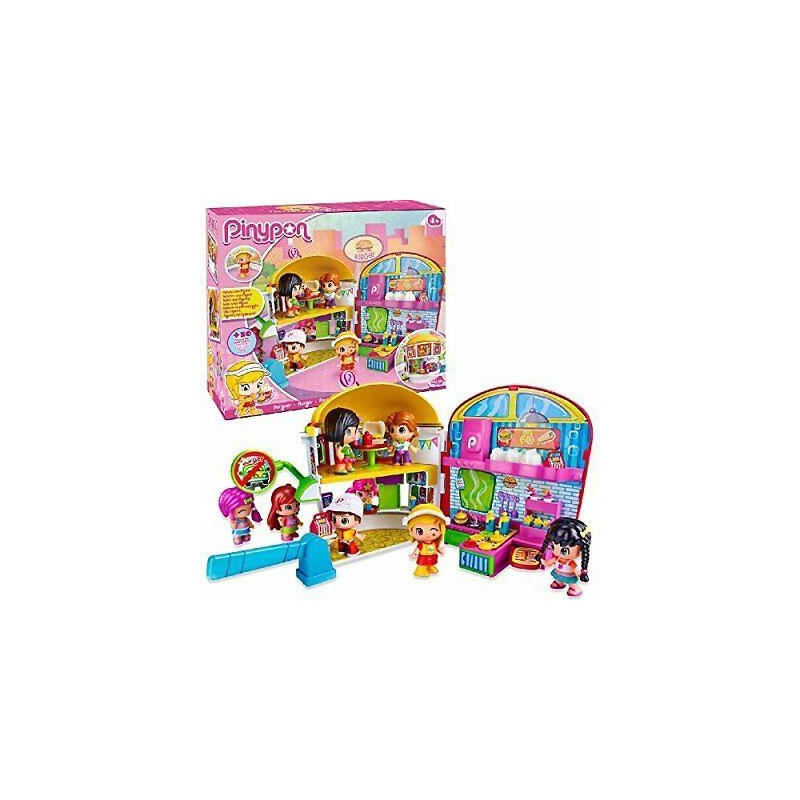 El divertido Burger de Pinypon tiene todo lo que tiene un restaurante de verdad Tiene muchos accesorios y detalles, incluyendo cajitas para los menús, bandejas para llevar la comida y dispensador de helados Es un "Burger auto" - con barrera para los pedidos desde el coche Con asa para llevarlo fácilmente donde quieras Incluye una figura de la camarera Pinypon