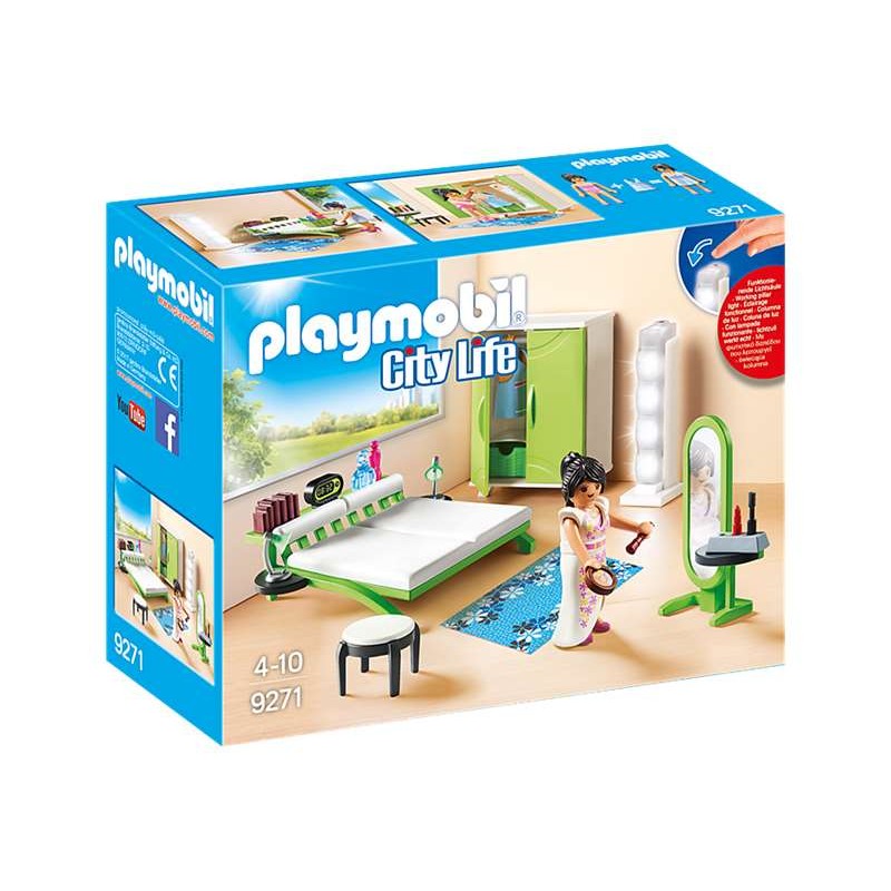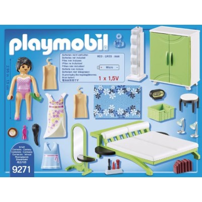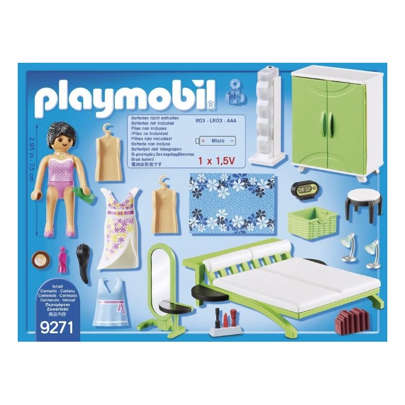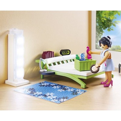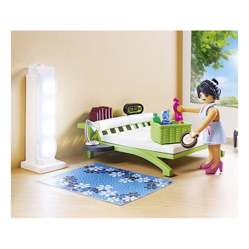 El dormitorio, un oasis de paz y relajación. Aquí encontrarás todo lo que necesitas para una buena noche de sueño. Por la mañana, cuando papá está en el baño, mamá escoge su ropa en el armario, luego se aplica su nuevo maquillaje delante del tocador. Ahora puede empezar el día. La columna de luz funcional se puede colocar individualmente en la habitación (Baterías no incluidas).