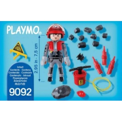 Figura equipada con casco, guantes. Un dispositivo explosivo, 2 cartuchos de dinamita, 9 piedras pequeñas, 1 piedra grande que se abre por la mitad y en su interior un cristal rojo.