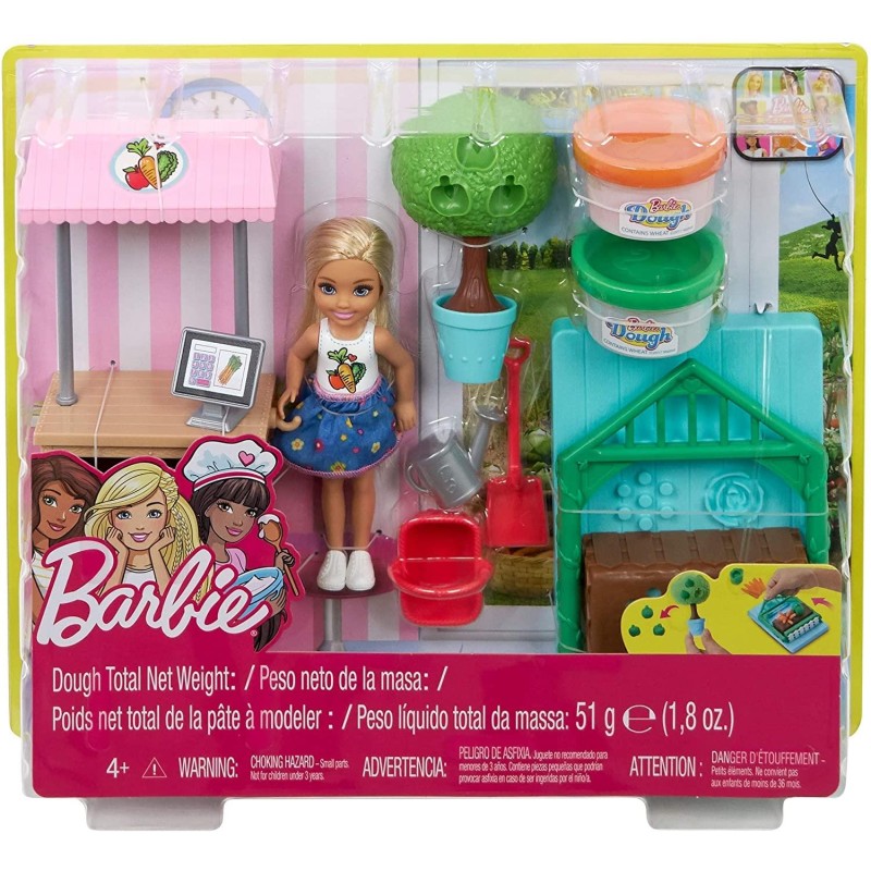 ¡Cultiva de forma sostenible frutas y verduras! ¡Con el nuevo Huerto de Chlesea! Chelsea es una niña concienciada con el Medio Ambiente, por ello cultiva su propio huerto ecológico y vende las frutas y las verduras a todos aquellos que se desplazan hasta su huerto. Ayuda a esta genial jovencita a conseguir las manzanas más deliciosas, las lechugas más frescas y las zanahorias más apetecibles; todo ello y mucho más en su querido y sostenible huerto. ¡Descubre muchas aventuras más junto a Chelsea y el resto de Playsets disponibles en nuestra web! ¡Completa tus historias con Barbie y todos sus amigos! Edad recomendada: + 4 años. Incluye: 1 muñeca Chelsea, 1 huerto, 1 puesto de frutas y verduras, 1 manzano, 1 pala, 1 cesta, 1 regadera, plastilina naranja y plastilina verde. Medidas aproximadas de la muñeca Chelsea: 13 cm de alto, 4 cm de ancho y 2,5 cm de fondo. Medidas aproximadas del puesto de frutas y verduras: 20 cm de alto, 8,8 cm de ancho y 4,5 cm de fondo.