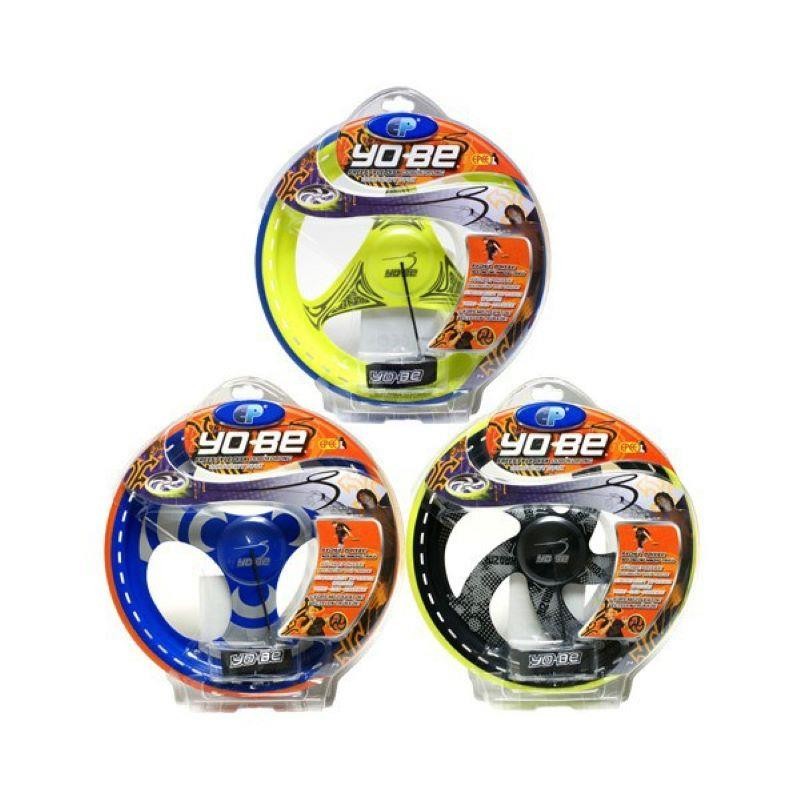 Acrobacias sin fin con el disco volador Yo-Be. El producto está compuesto por un disco de material ligero unido a una cuerda que puedes atar a tu muñeca con una correa. El disco posee un diámetro de 32 cm.