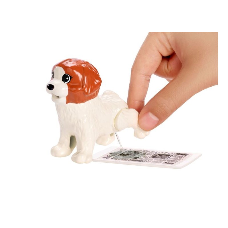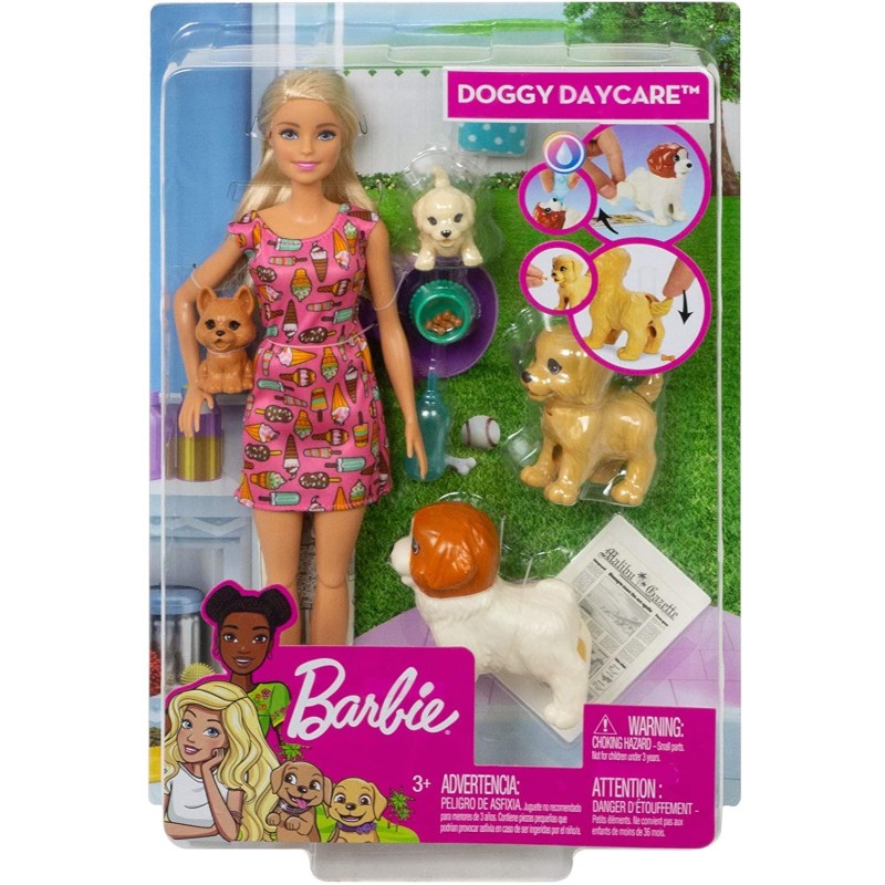 Barbie ha comenzado a trabajar en una guardería cuidando a cuatro adorables perritos. Les da de comer, los lava, les limpia el pipí y la caca y juega con ellos. Ayuda a Barbie con su tarea en la guardería de perritos. Llena la pequeña botella azul y dale de beber al perro de color blanco, cuando acabe tendrá ganas de hacer pipí y cuando lo haga sobre el periódico, ¡éste cogerá un color amarillento!. Dale los tres huesos al perrito de color beige, ¡querrá hacer caca cuando termine de comer!. Barbie lleva un vestido rosa con un estampado muy original. Incluye una muñeca Barbie con un conjunto de moda y zapatos, un perrito que hace caca, un perrito que hace pipí, dos perritos pequeños, una botella de agua, un cuenco de perro, tres huesos, una manta y un periódico que cambia de color. Mattel. Ref.: FXH08. Edad recomendada: +3 años.
