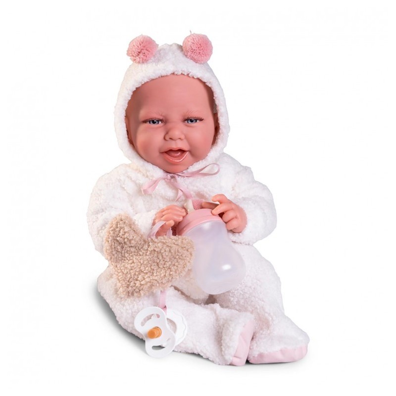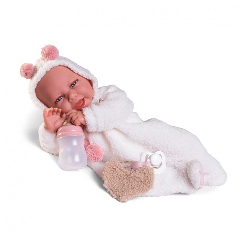 La Recién Nacida con peso Carla de Muñecas Antonio Juan es un tesoro en forma de juguete, diseñada para brindar una experiencia de juego profundamente emotiva y realista. Su peso específico la convierte en una compañía similar a la de un bebé real, ofreciendo a los niños una sensación única al abrazarla. Carla, con su expresión dulce y un buzo de borreguillo adornado con una capucha y pompones, está hecha para ser cuidada y amada, estimulando sentimientos de ternura y compasión en cada interacción. Accesorios como un chupete con cinta, un peluche para compañía y un biberón para los momentos de alimentación, enriquecen la interacción, aportando una capa de realismo y cuidado a las sesiones de juego.
