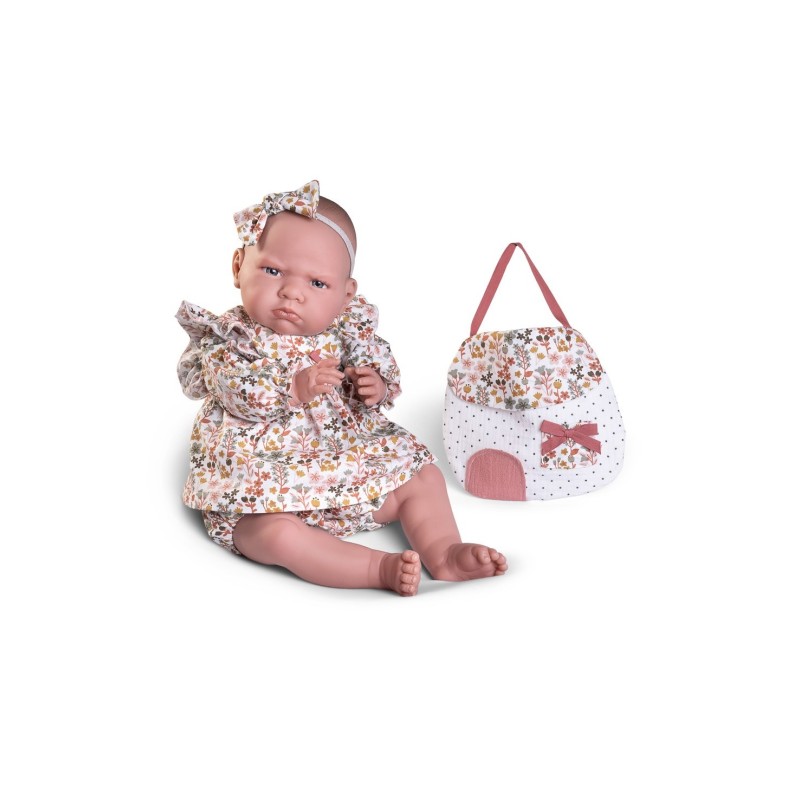 Mi primer reoborn Berta bolsita casita de Muñecas Antonio Juan es una muñeca realista con las que podrás disfrutar como de un bebé casi real. Fíjate en su manicura, el peso o la babita que le asoma entre los labios... Una elección perfecta pensando en el juego de los más pequeños. Mi Primer Reborn Berta lleva una bolsita en forma de casita para ti. Podrás llevar en ella sus juguetes cuando salgas a pasear. Berta va vestida con un bonito vestido de flores a conjunto de su diadema. Además lleva pañal como un bebé de verdad. Mide 52 cm. Incluye: Diadema, vestido, culotte, pañal, bolso y un libro de familia para tu Reborn de Muñecas Antonio Juan.