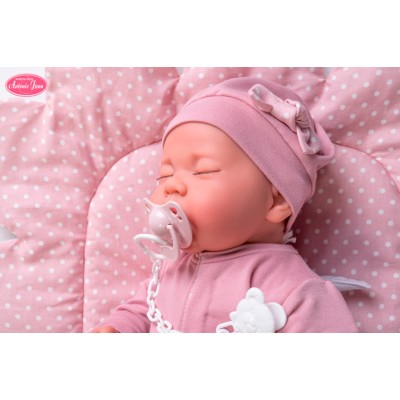 Que ternura mirar a Luna mientras duerme en su bonito cojín en forma de flor. Pon el cojín dentro de su caja y servirá como cunita para Luna. ¿Has visto que alitas tiene su pijama por detrás? ¡Es un angelito! Le encanta que la acurruques y la mimes. Su cuerpo es de tela blandito para poder abrazarla suavemente y su cara y extremidades de suave vinilo. Su ropa está confeccionada con tejidos "Organic Cotton", lo que significa que en su cultivo y en su proceso de producción no se han utilizado productos químicos, solo naturales. Mide 42 cm y pesa 800 gr. ¡Estará encantada de que la abraces! Puede colocarse en muchas posiciones como un bebé real porque sus extremidades giran, tiene movimiento, lo que le hace tener más realismo. ¿Hay algo más adorable que un bebé? Los Recién Nacidos son la esencia de Muñecas Antonio Juan. Un universo de dulzura creados para acompañar a los más pequeños a descubrir el mundo. Compañeros inseparables de largos días de juegos a los que no les falta detalle en sus tiernas facciones y calidad de su ropita y complementos.