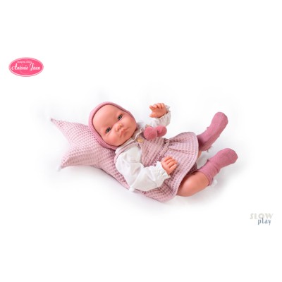 Hoy Nica va muy graciosa con su gorro con pompón azul. Tiene un cojín en forma de estrella con el que se pasa horas jugando, y cuando tiene sueño, se acurruca sobre el para descansar. Lleva un bonito peto con camisa. Su cuerpo es de tela blandito para poder abrazarla suavemente y su cara y extremidades de suave vinilo. Mide 42 cm y pesa 800 gr. ¡Estará encantada cuando juegue contigo! Puede colocarse en muchas posiciones como un bebé real porque sus extremidades giran, tiene movimiento, lo que le hace tener más realismo. ¿Hay algo más adorable que un bebé? Los Recién Nacidos son la esencia de Muñecas Antonio Juan. Un universo de dulzura creados para acompañar a los más pequeños a descubrir el mundo. Compañeros inseparables de largos días de juegos a los que no les falta detalle en sus tiernas facciones y calidad de su ropita y complementos.