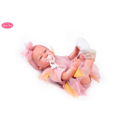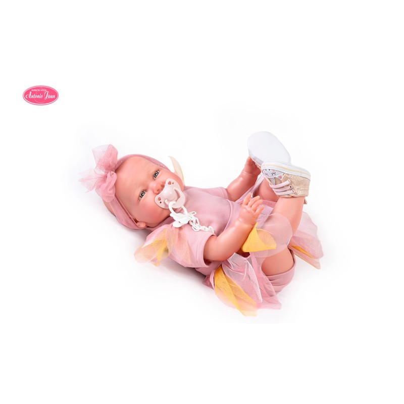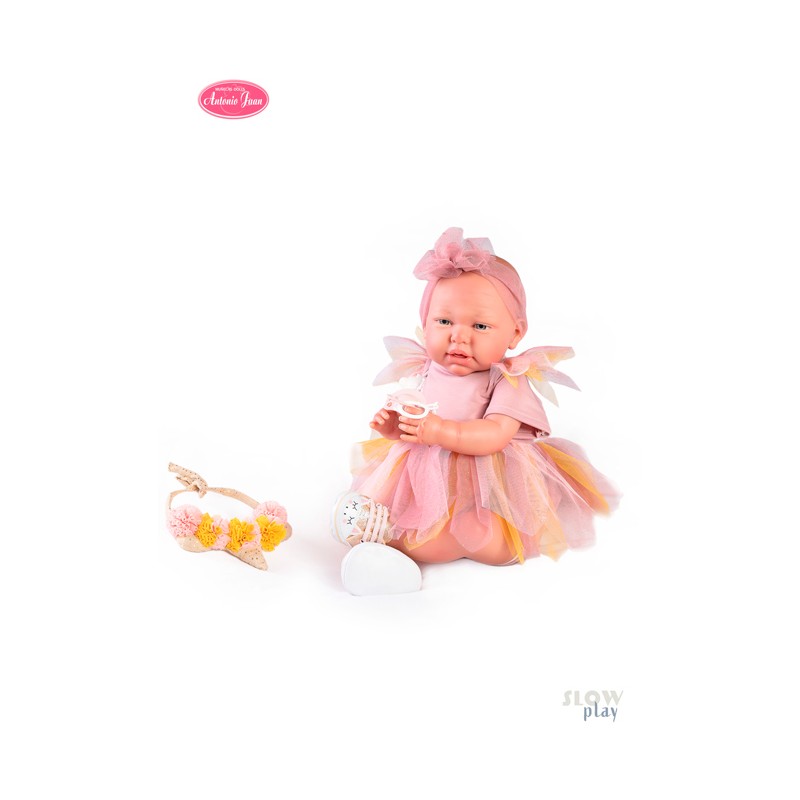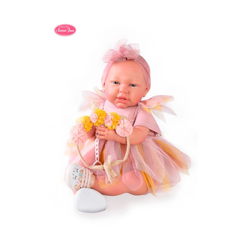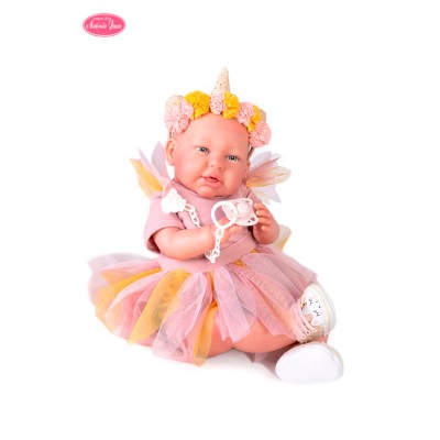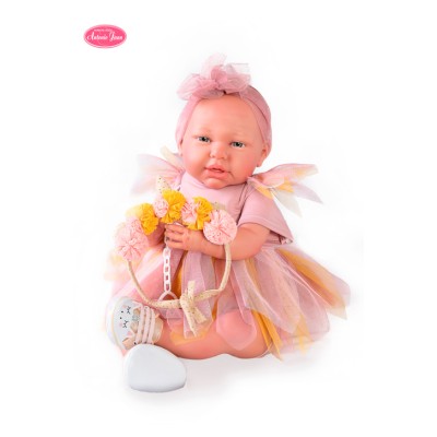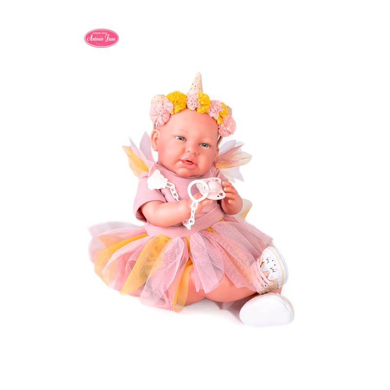 Mi Primer Reborn son muñecas realistas con las que podrás disfrutar como de un bebé casi real. Fíjate en su manicura, el peso o la babita que le asoma entre los labios... Una elección perfecta pensando en el juego de los más pequeños. Mi Primer Reborn Daniela Hada con diadema para ti, va vestida con un gracioso conjunto de falda y de tul, con unas alitas en los hombros. Con sus zapatos de orejitas brillantes está encantada de jugar contigo. Daniella lleva una diadema de tul y tiene otra para ti de unicornio con pompones. Daniela es muy traviesa y te está esperando para jugar contigo. Además lleva pañala como un bebé de verdad. Pesa 1670 gr. y mide 52 cm. Incluye un libro de familia para tu Reborn de Muñeas Antonio Juan.