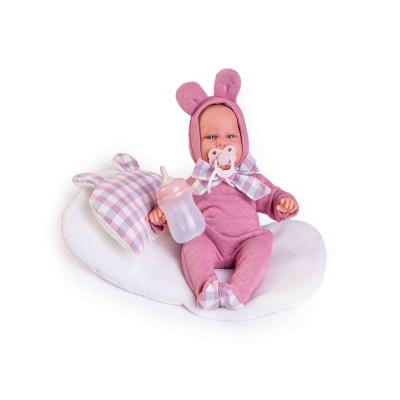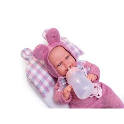 Blandito y de tacto especial, con cuerpo de tela y extremidades de suave vinilo, es un pequeño bebé fácil de manejar en el juego. Si le aprietas su barriguita balbucea para que disfrutes escuchando sus primeros sonidos y ampliar las posibilidades de juego. Baby Clara palabritas lleva un pijama de tela acolchada con un gorro con orejitas. Cuando está cansado se tumba en su camita a tomar su biberón sobre su bonito cojín. Mide 33 cm. y pesa 550 gr. Baby Toneta, de Muñecas Antonio Juan está esperando poder jugar contigo y que la lleves a pasear con su mochila.
