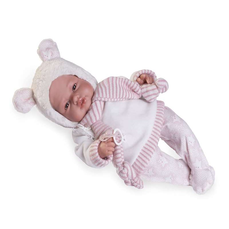 Babydoo es el nuevo bebé de la familia Muñecas Antonio Juan y está a punto de empezar a decir sus primeras palabras. Si le aprietas la barriguita se pueden escuchar sus balbuceos. Es todo ternura, con su cuerpo blandito y de gran tamaño para poder abrazarlo y acunar como un bebé de verdad. Mi de 50 cm y pesa 1005 gr. ¡qué gracioso va con su capota con orejitas! Su tela es de suave borreguillo. Con su jersey y pantalón a juego con su bufanda, está preparado para pasar un buen día de juegos.