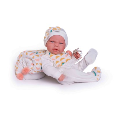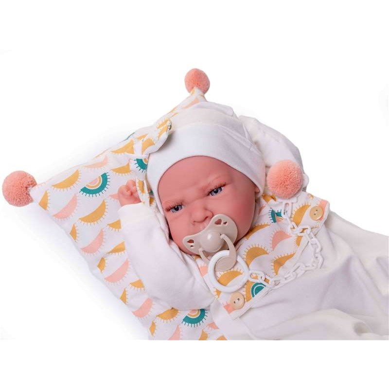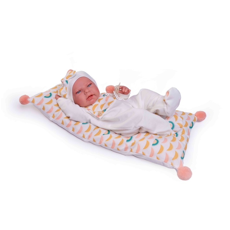 La Recién Nacida Lea, está muy alegre porque tiene un nuevo cojín en el que descansar con bonitos dibujos de soles. Además, le han regaldo un pijama con gorrito a juego con el que está guapísima. ¡Con Lea podrás jugar a todo lo que puedas imaginar! Su cuerpo es de suave vinilo sexuado. Mide 42 cm y le encantará que la abraces para dormir. ¿Hay algo más adorable que un bebé? Los Recién Nacidos son la esencia de Muñecas Antonio Juan. Un universo de dulzura creados para acompañar a los más pequeños a descubrir el mundo. Compañeros inseparables de largos días de juegos a los que no les falta detalle en sus tiernas facciones y calidad de su ropita y complementos.
