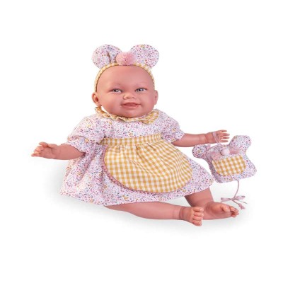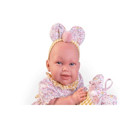 Mi Primer Reborn son muñecas realistas con las que podrás disfrutar como de un bebé casi real. Fíjate en su manicura, el peso o la babita que le asoma entre los labios… Una elección perfecta pensando en el juego de los más pequeños. Mi Primer Reborn Martina ratoncita, viene con un guardadientes para los pequeños de la casa, donde podrán poner sus dientes bajo la almohada cuando tenga que visitarles el ratoncito Pérez. Martina está muy guapa con su diadema de orejitas a juego con su vestido. Su ropa está confeccionada con tejidos «Organic Cotton», lo que significa que en su cultivo y en su proceso de producción no se han utilizado productos químicos, solo naturales. Además lleva pañal como un bebé de verdad. Pesa 1685 gr. y mide 52 cm. Incluye un libro de familia para tu Reborn de Muñecas Antonio Juan.