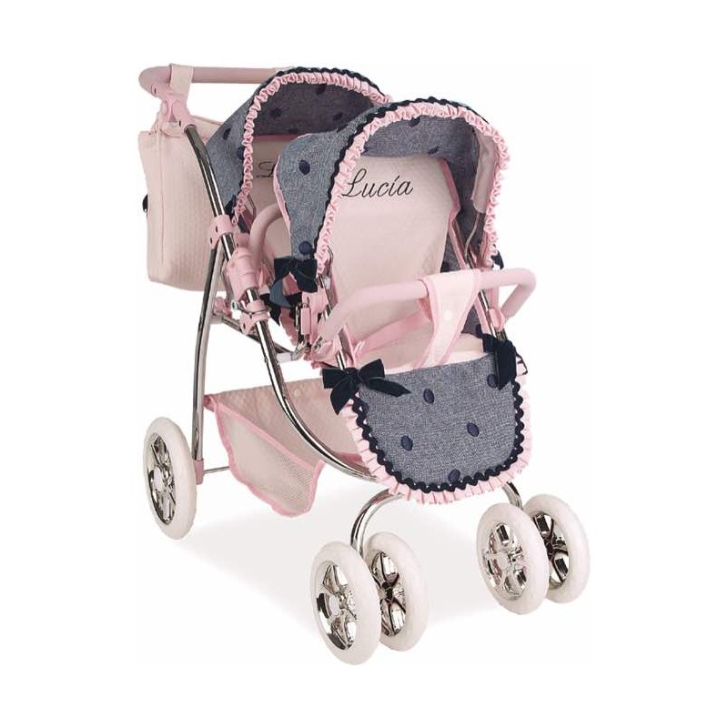 El coche gemelar Lucía de la marca Arias es un coche de ensueño...Sus colores y detalles lo hacen único, además es un carro de muñecas muy práctico ya que es plegable. También incluye un bolso a juego y una cestita de tela en la parte inferior del coche. Altura del manillar 47-77cm. Medidas: 45X70X73 cm. Recomendado para mayores de 3 años.