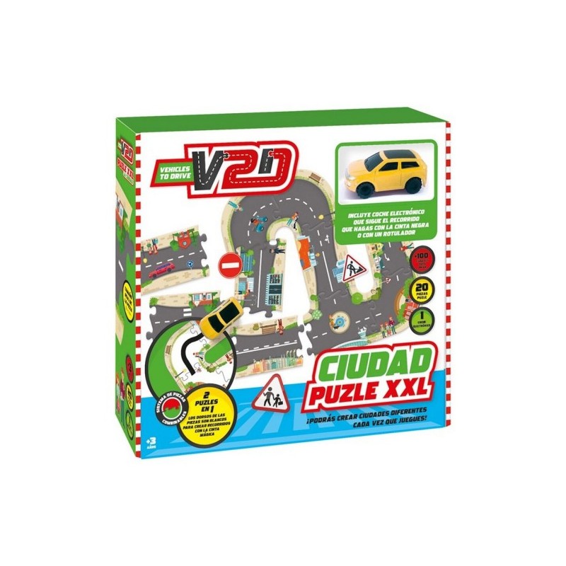 Edad recomendada: +3 años. Puzzle troquelado gigante. Piezas intercambiables. Construye circuitos diferentes cada vez. 50 piezas en total. Modelo: La Ciudad. Incluye coche y cinta adhesiva negra