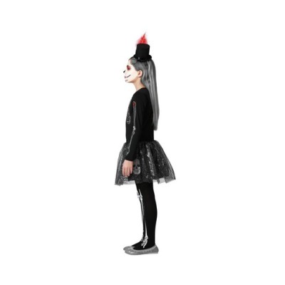 Disfraz vestido esqueleto brillante infantil. Contenido: 1 vestido negro ajustado decorado con un esqueleto y calaveras en la falda brillante y un tejido superpuesto semitransparente.
