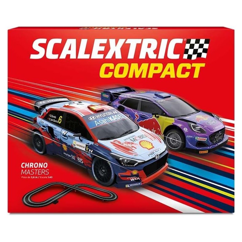 Circuito Scalextric Compact en forma de 8, escala 1:43. Cuatro variantes de trazado para más diversión. Mandos Wireless específicos para la mano del niño y con turbo para experimentar una aceleración espectacular. Dos coches con luces incluidos y disfruta del gran puente. ¡Adelanta a tu compañero y sé el primero en pasar por la meta! Pon a prueba tu experiencia de piloto y compite con dos coches de rally. Mandos con Función Turbo y Puente. Ayuda a desarrollar las habilidades psico-motrices, reflejos y capacidad de concentración de los niños. Es el juguete ideal para fomentar la interactividad entre padres e hijos, a la vez que estos últimos aprenden jugando.