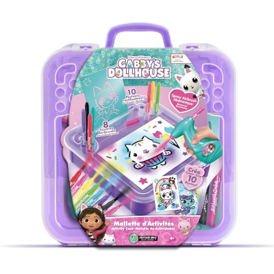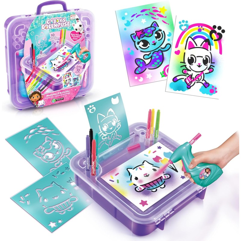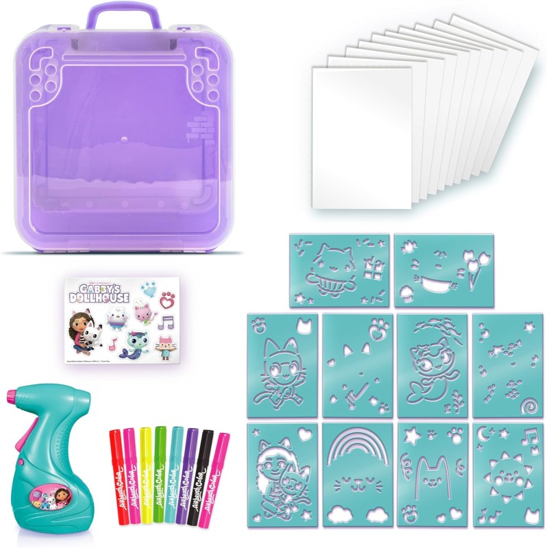 CONTENIDO: 1 estuche, 1 spray electrónico, 8 rotuladores, 10 hojas de plantillas originales, 1 hoja de pegatinas con los colores de Gabby, 10 hojas de dibujo en blanco y 1 folleto de instrucciones. El spray funciona con 2 pilas AA/LR6 (no incluidas).