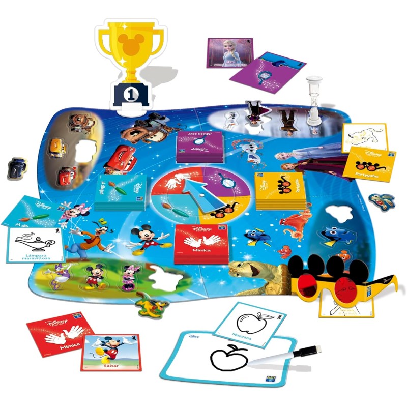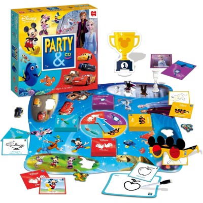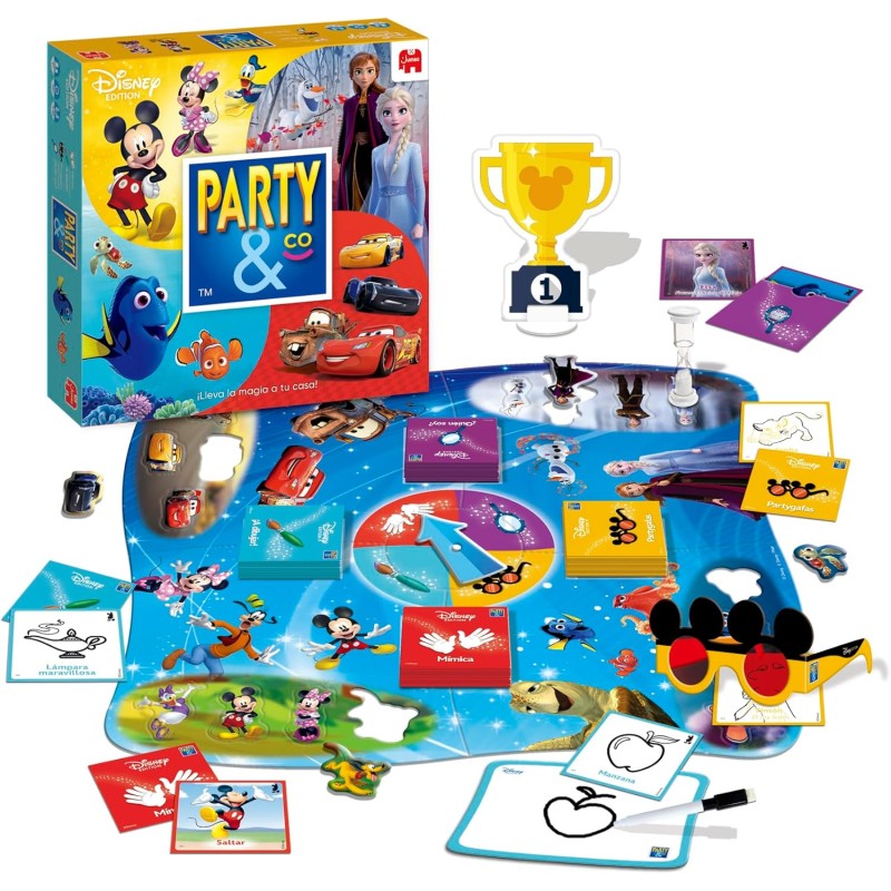 Con la versión Party&Co Disney los más pequeños de la casa demostrarán quién es el que sabe más sobre el mágico mundo Disney a través de diferentes pruebas: mímica, el dibujo, la imaginación y la memoria. El objetivo del juego es muy sencillo; se trata de conseguir los 4 personajes de sus películas favoritas para encajarlos en el lugar que les corresponde del tablero.Trofeo Mickey, sobre ¿Quién Soy?, reloj de arena 30 segundos, 240 tarjetas con pruebas, PartyRuleta, PartyGafas, pizarra, rotulador borrable, 4 piezas tablero-puzzle, 16 fichas con personajes Disney.