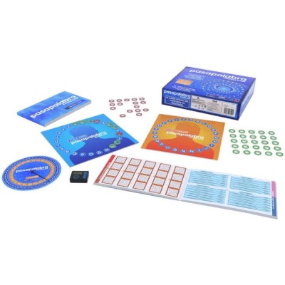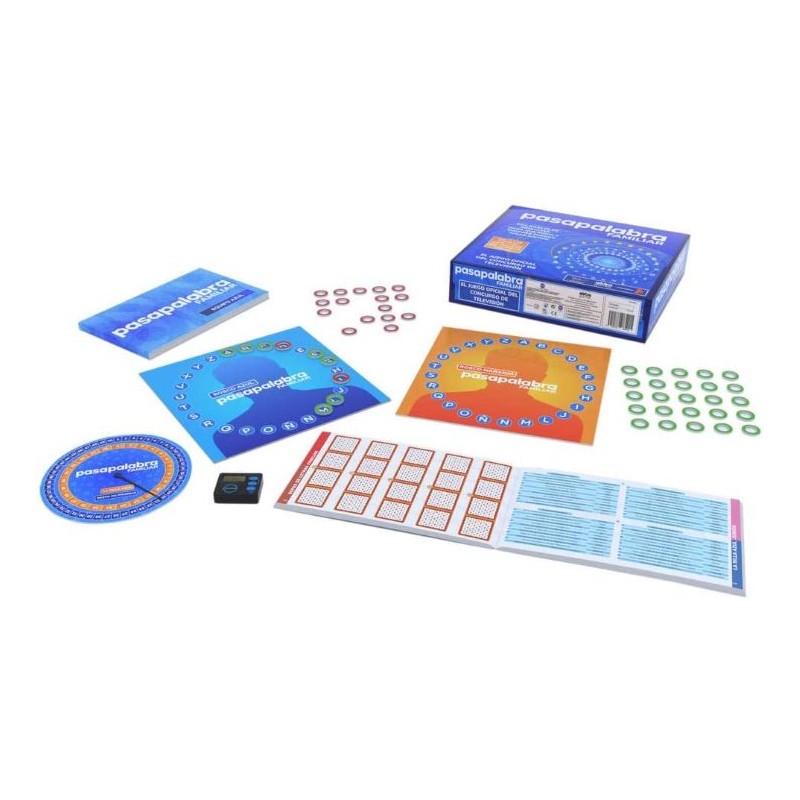 Tiene cantidad de componentes: 2 libros de preguntas y respuestas, 1 lápiz, 2 roscos, 50 fichas redondas de marcador, 1 ruleta 2 cronómetros