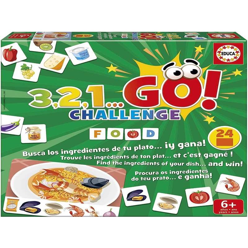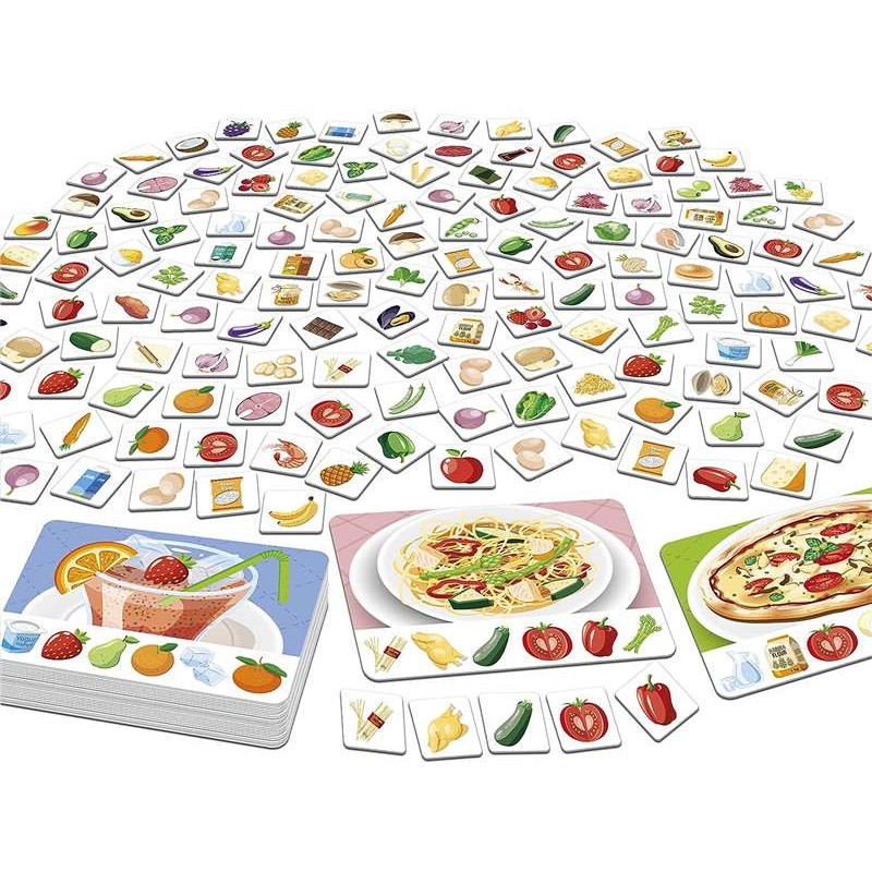 Se disponen encima de la mesa todos los ingredientes mezclados boca arriba, y cada jugador coge una carta de comida y tendrá que buscar los ingredientes para crearla.