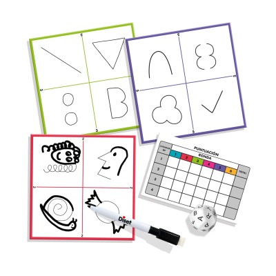 La caja inluye: 12 tableros reversibles con garabatos, 1 dado de letras, 4 rotuladores borrables, una pizarra de puntuación.