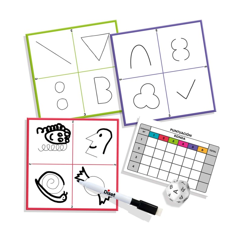 Todos los jugadores cogerán el mismo tablero con unos garabatos predeterminados, se tira el dado de letras y todos los jugadores tendrán que dibujar sobre el tablero 4 cosas que empiecen por la letra que haya salido en el dado utilizando los garabatos predeterminados como base. Así se realizará turno tras turno, con los distintos tableros, hasta completar las 6 rondas del juego.