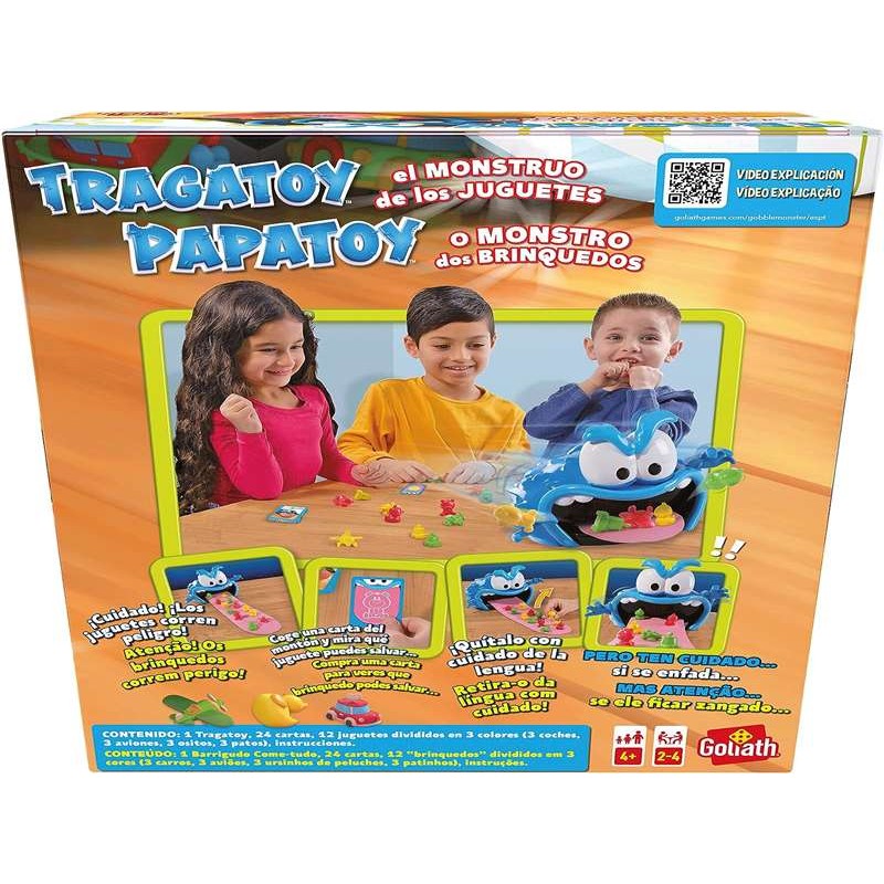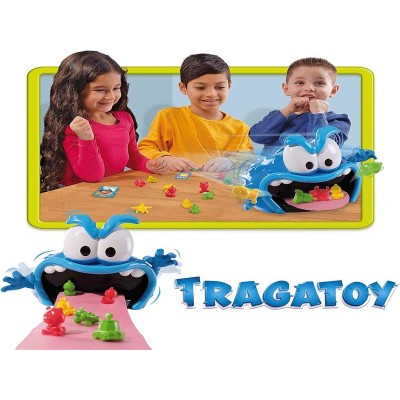 ACCIONES EN LA LENGUA DE TRAGATOY: Coloca todos los juguetes en la lengua larga de Tragatoy y prepárate para la diversión. Coge una carta que te indicará qué hacer: salvar un juguete de cierto color, moverlo de un lugar a otro en la lengua o quitarle uno a otro jugador. Pero ten cuidado, nunca se sabe cuándo Tragatoy puede enfadarse, tragarse todos los juguetes y salir corriendo