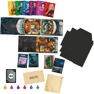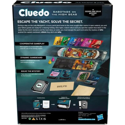 Has aceptado una invitación a unas vacaciones pagadas con todos los gastos a bordo del yate de lujo Lady Marigold II, un casino buscado propiedad del Capitán Melville. Una noche, una tormenta entra y el capitán se ve boca abajo en el mar A medida que el barco toma agua, tú y tus compañeros jugadores se ponen a prueba: Trabaja juntos para escapar del yate y determinar quién empujó al capitán por la borda, dónde sucedió y por qué. Este juego de mesa Clue Sabotage on the High Seas Escape & Solve Mystery ofrece personajes clásicos de Clue e intriga en un fascinante juego de sala de escape. Los jugadores mueven sus peones alrededor del tablero de juego construido habitación por habitación, mientras exploran el yate, dibujan tarjetas, resuelven rompecabezas, desbloquean nuevas habitaciones en el barco y descubren pistas. Después de superar el yate, los jugadores revisan las pistas y usan la deducción para hacer una acusación correcta y ganar Esta experiencia cinemática de sala de escape de un solo juego es para 1-6 jugadores, a partir de 10 años