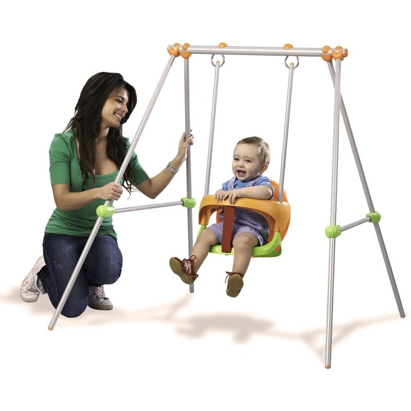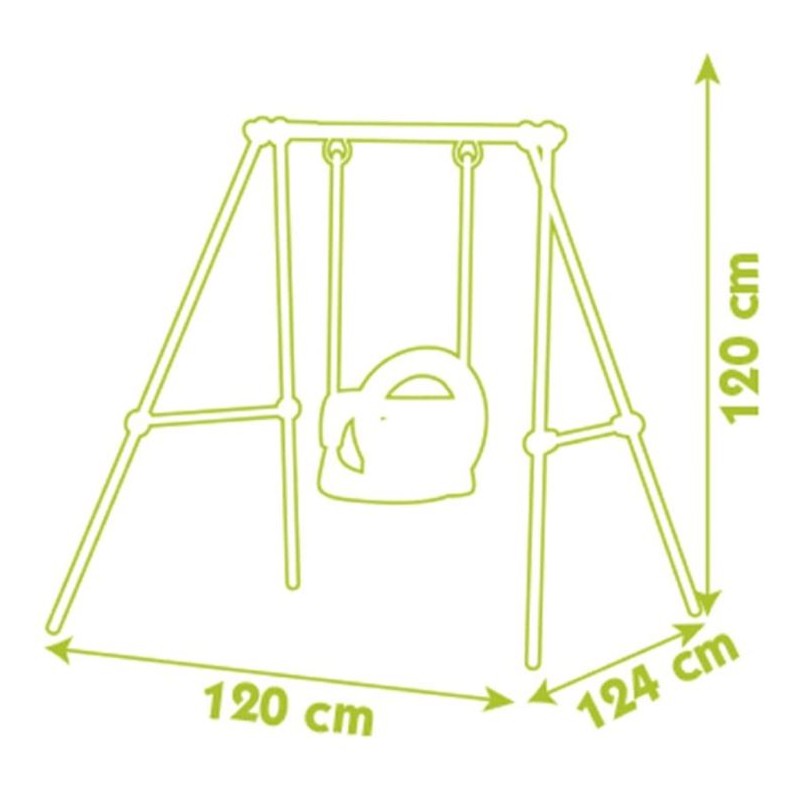 Columpio infantil de 120 cm. de alto. Estructura de tubo de acero de fácil ensamblado y alta resistencia. Asiento evolutivo de plástico rígido y seguro, anillo de seguridad separable. Protectores en la terminación de todos los tubos. Se puede utilizar tanto en interior como en exterior. Todo el plástico utilizado ha sido sometido a nuestro tratamiento Anti-UV que protege el color y la resistencia del plástico aumentado su duración.