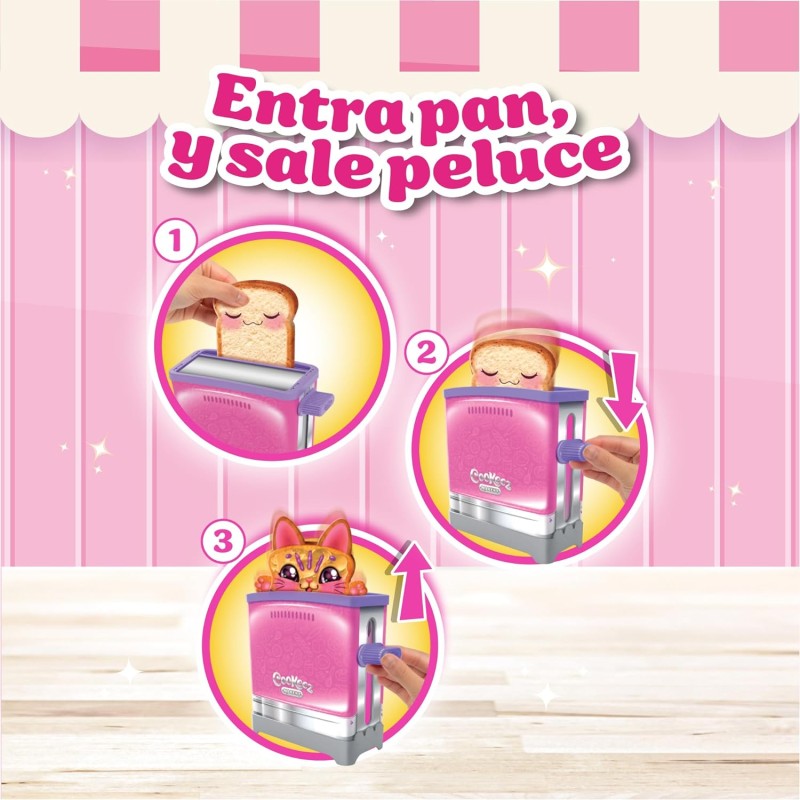 Este juguete combina la diversión de un peluche con la emoción de una sorpresa. Al insertar la carta mágica con forma de tostada en la Tostadora de Cookeez Makery, los niños se sorprenderán al ver cómo se transforma en un adorable peluche con aroma dulce.