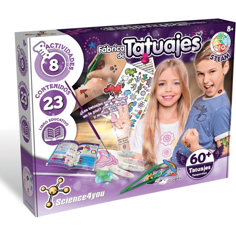 ? Tatuajes Temporales para Niños +8 Años? Con las 8 actividades de este laboratorio de ciencias para niños, aprenderá a hacerse sus propios tatuajes temporales infantiles. Conoce la historia de los tatuajes y usa los 23 contenidos y manualidades de esta fábrica de tatuajes para hacer experimentos científicos.