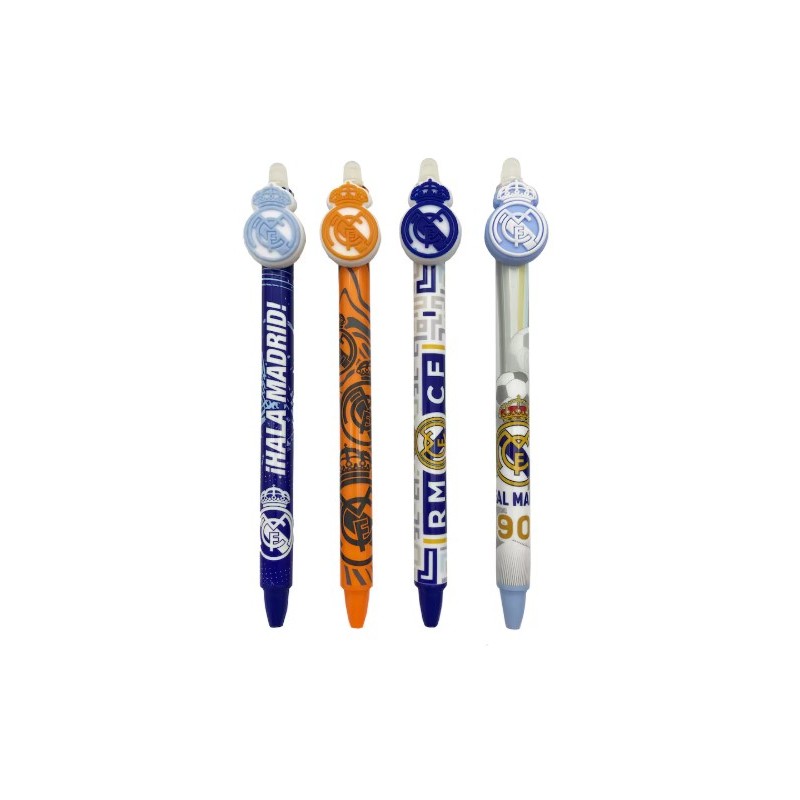Bolígrafo borrable de la marca Real Madrid CF. Utiliza tinta de gel que se puede borrar sin dejar rastro. Es retráctil y presenta motivos del club. Se ofrece en diferentes modelos, disponibles según existencias. Fabricado en España, cumple con la normativa europea de calidad y está elaborado con materiales resistentes. PRECIOS POR UNIDAD, SE ENVIARÁ UN MODELO SUJETO A DISPONIBILIDAD