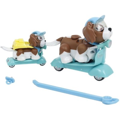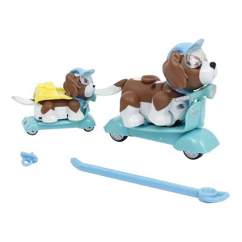La familia está lista para un viaje en Scooter Incluye 1 cachorro, 1 bebe cachorro, 1 scooter grande 1 scooter pequeña y accesorios Nuevos miembros se unen al Club Pet Parade