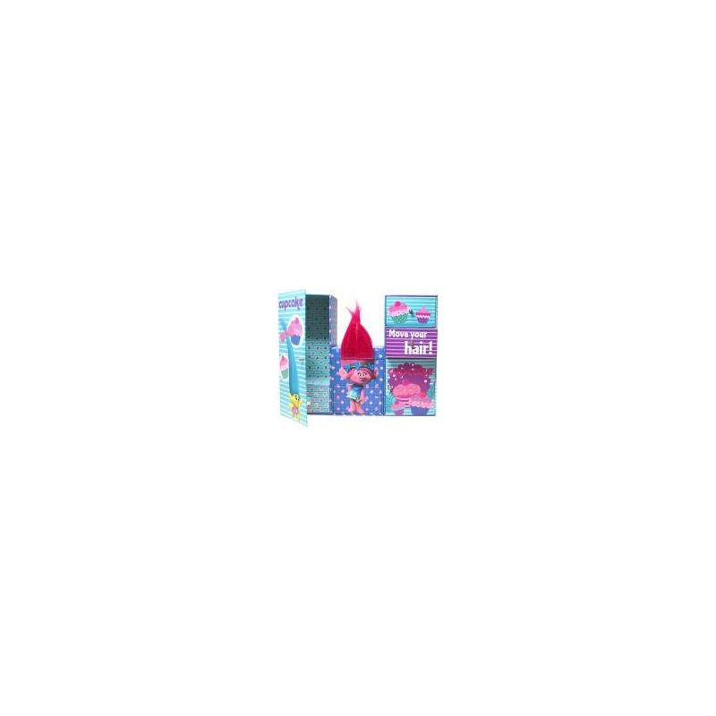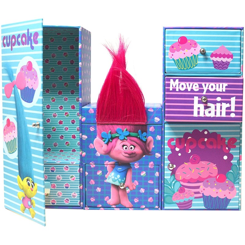 Taquilla Triple Deluxe Trolls que contiene hoja de gemas, tapes y lazos para quela decores y guardes todas tus cosas.