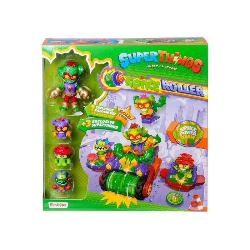 ¡El malvado Spike Roller de la serie SuperThings Kazoom Kids llega con todo su equipo, el Spike Power Team, para hacer travesuras en Kaboom City! Gracias a su gran vehículo con detalles dorados, está preparado para aplastar a cualquier se que interponga en su camino. ¡Y no está solo en su misión! 3 SuperThings exclusivos le acompañan junto con dos pequeños vehículos villanos que lanzan discos y se acoplan al transporte principal: ¡maxi poder para los villanos! El último secreto villano es la pieza flexible trasera del vehículo: ¡hazla saltar desde el suelo para atacar a los héroes por sorpresa!